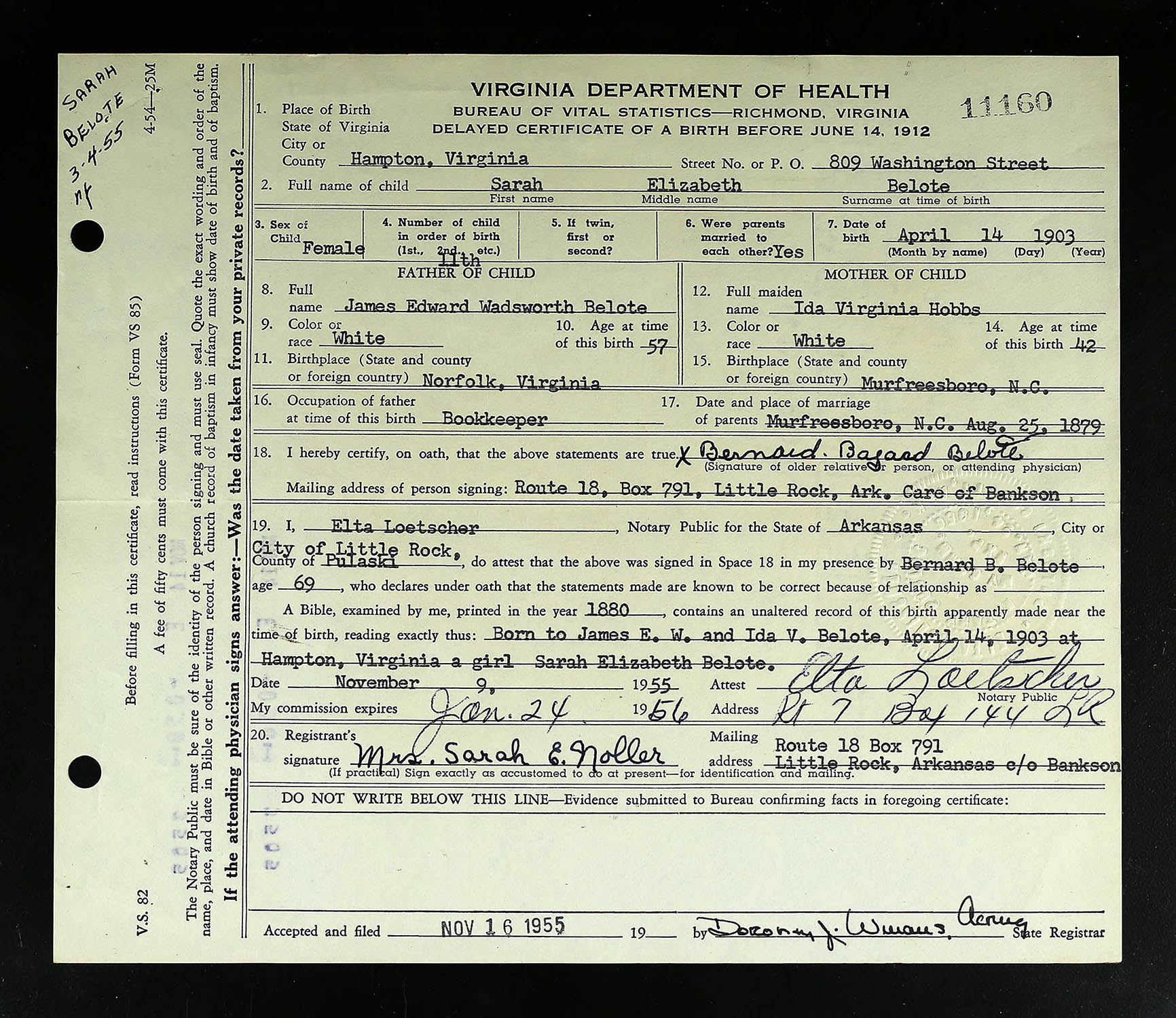 Delayed Birth Certificate for Sarah Elizabeth Belote (born April 14, 1903)