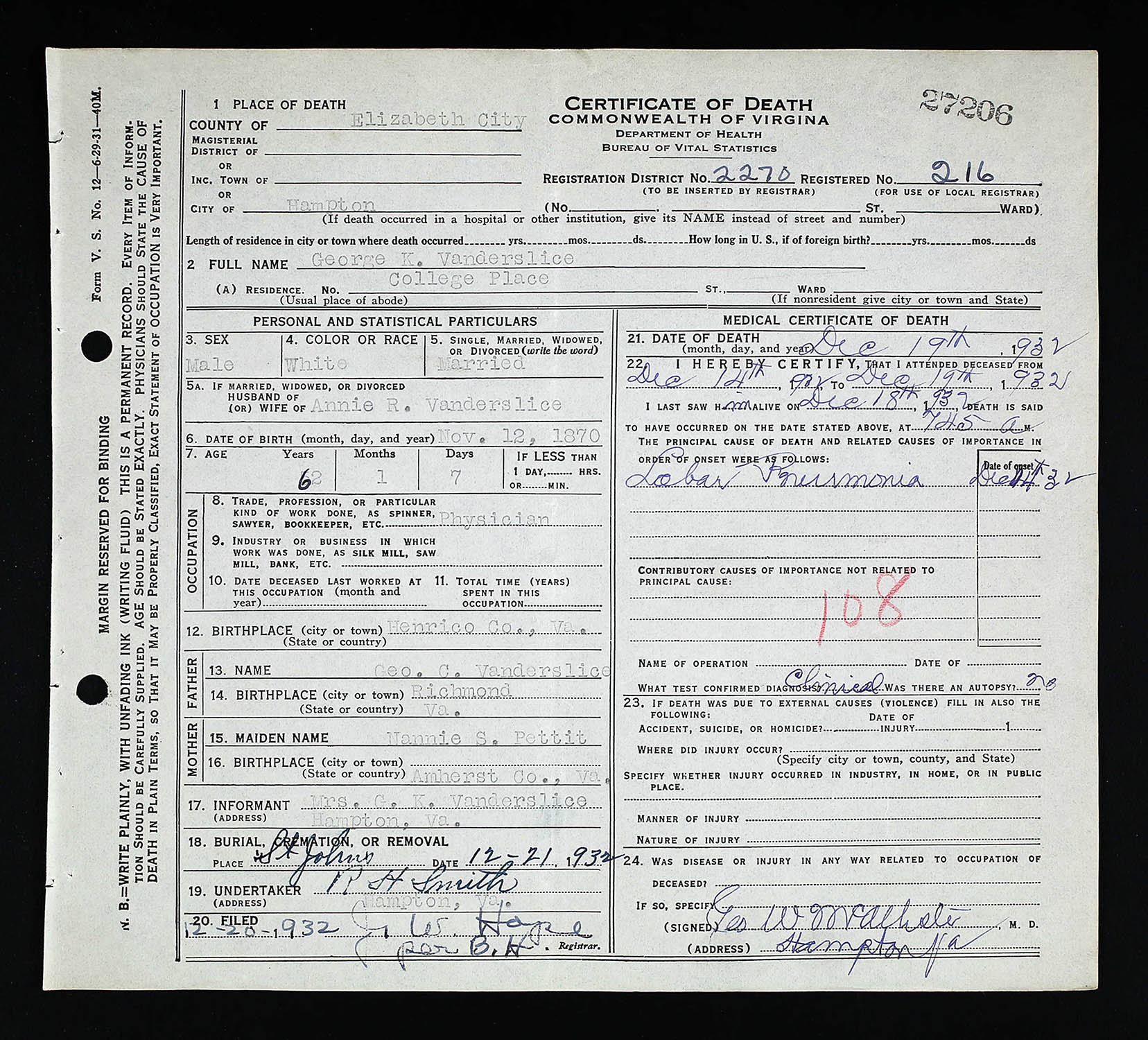 Death Certificate of George K. Vanderslice (died December 19, 1932)