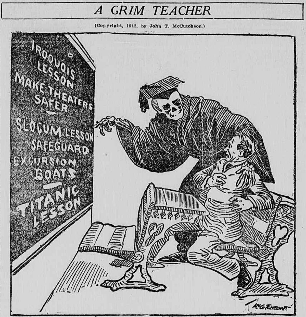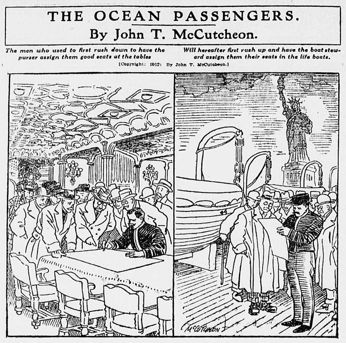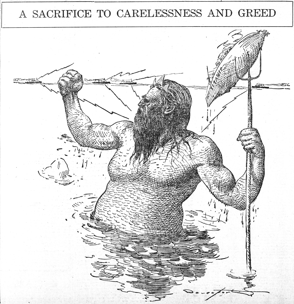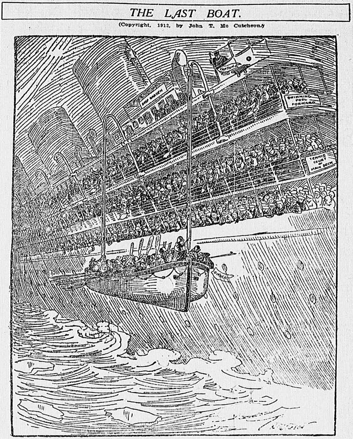 In 1912 journalistic photography was still evolving and becoming more impactful while the editorial cartoonist provided a complementary service, reflecting the popular emotion and sentiment of the tragedy in a way photos did not. Two basic slants were taken by the artists: the defeat of man by nature, and the heartrending sadness of the loss itself. The following cartoons highlight these themes, of particular note are those of John T. McCutcheon, a syndicated artist whose work often appeared in the Times-Dispatch of Richmond, Virginia.